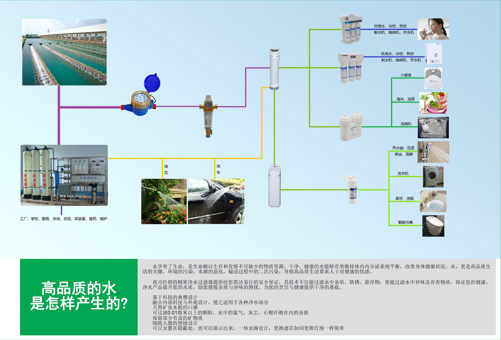 戶內(nèi)全方位分質(zhì)供水系統(tǒng) 1、戶內(nèi)分質(zhì)供水的概念:主要目的是為不同的用水需求提供不同的解決方案。 2、戶內(nèi)分質(zhì)供水系統(tǒng)的組成 1、前置過濾器 2、管道凈水機3、管道軟水機 4、分管凈水機 5、分管純水機